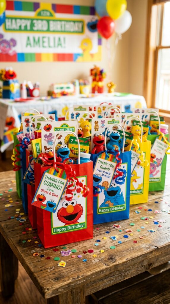 Fill each bag with Sesame favors like mini character figurines, Elmo stickers, and Cookie Monster temporary tattoos.