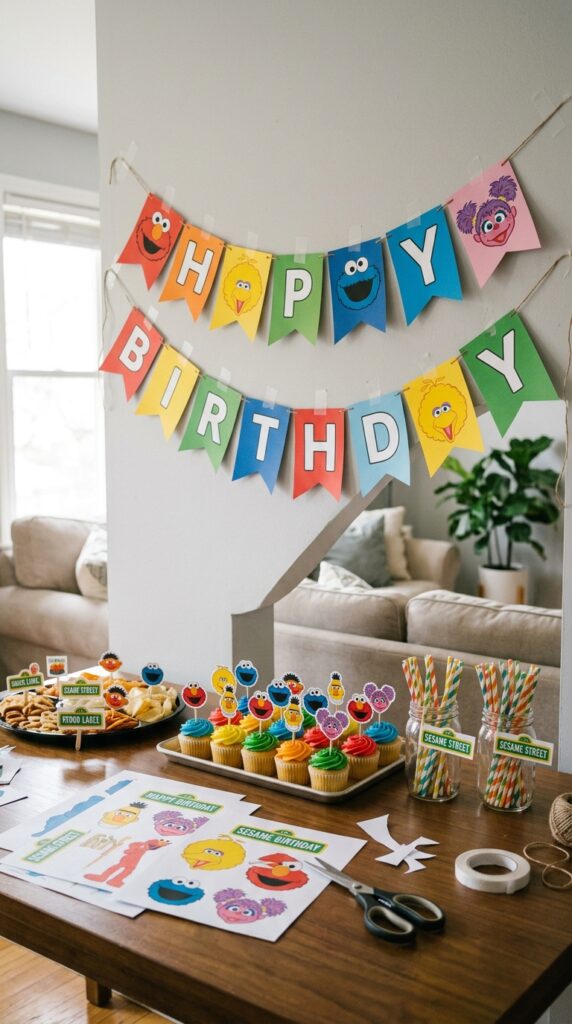 You’ll find printable banners featuring Elmo, Cookie Monster, and Big Bird that look professionally made once you cut and assemble them.