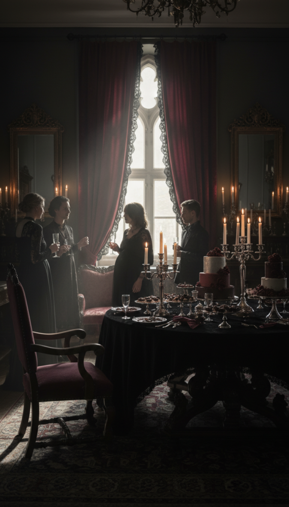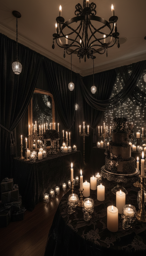 Your dramatic lighting effects make all the difference here. Swap bright overhead lights for dim table lamps and candles in ornate holders. Think Victorian elegance meets modern celebration – it’s surprisingly sophisticated and creates an intimate atmosphere that’ll have guests talking long after.