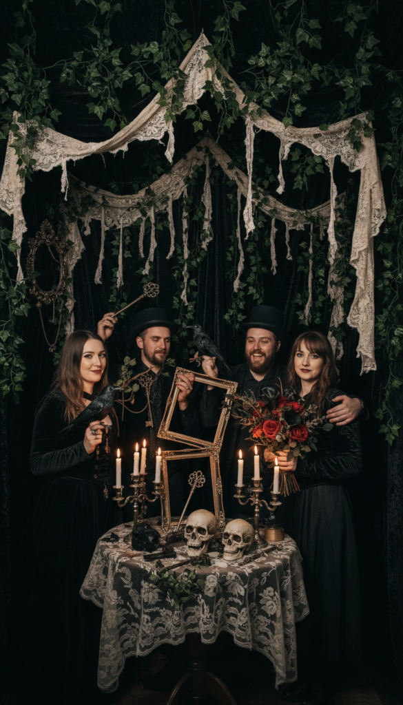 I’ve found that moody image booth backdrops work best when you layer textures. Think black velvet drapes paired with artificial ivy or vintage lace curtains. You’ll want props that tell a story—ornate frames, antique keys, and miniature ravens create haunting prop displays.