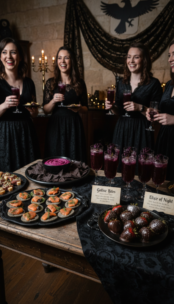For drinks, craft signature cocktails with moody cocktail garnishes like dried black roses or activated charcoal rims. A “Baby’s First Potion” made with blackberry juice and sparkling water looks absolutely stunning. Don’t forget virgin versions—pomegranate juice creates that perfect gothic red we’re after.