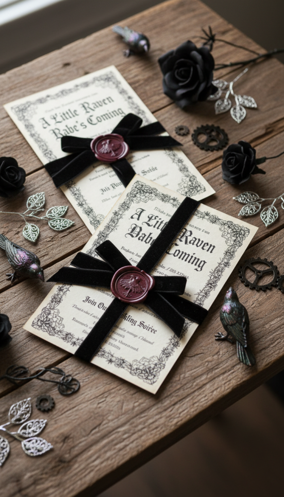 Don’t forget baby-themed gothic elements! Tiny skulls, dark florals, and “Little Raven” signs keep things playful yet spooky. I recommend setting up dramatic lighting with battery-operated candles for that perfect moody ambiance without fire hazards.