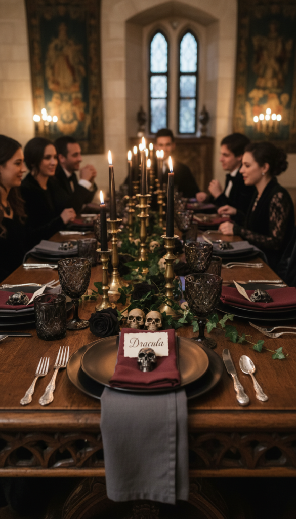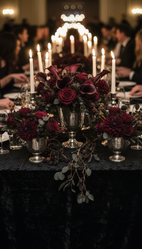 Small touches matter: miniature skulls as place card holders, or dark roses scattered between plates create that perfect gothic sophistication.