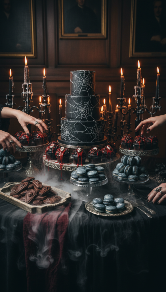 I’ve found that haunting dessert centerpieces work best when you layer different heights. Try a three-tier black cake decorated with edible silver spiderwebs, surrounded by chocolate coffin cookies and midnight macarons.
