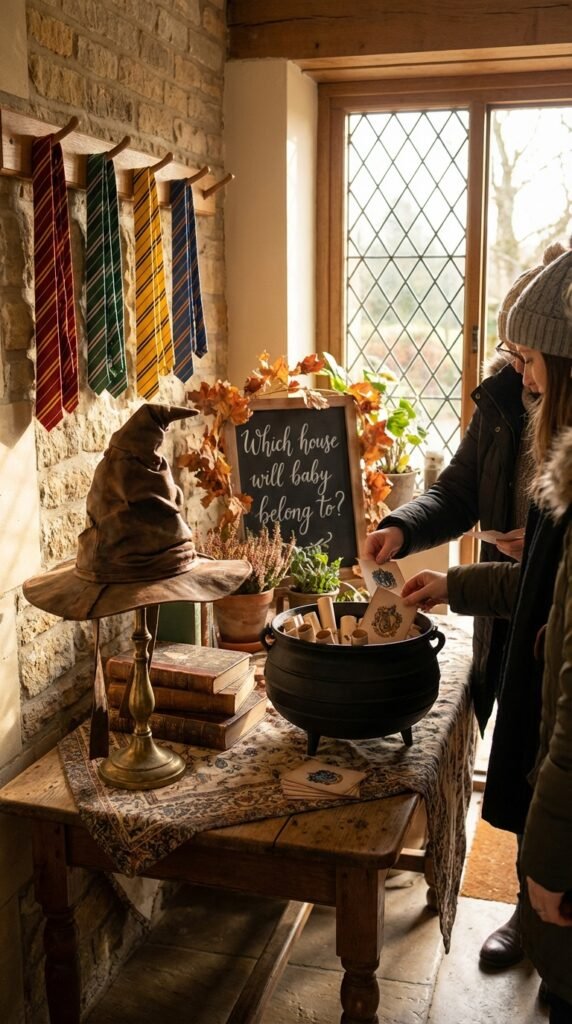 Every magical celebration needs a proper welcome, and nothing sets the tone quite like a Sorting Hat station that greets your guests at the door. Create a magical hat display using a weathered brown hat positioned on a decorative stand or antique book stack. Add a handwritten sign reading “Which house will baby belong to?” alongside colored ribbons representing each Hogwarts house.