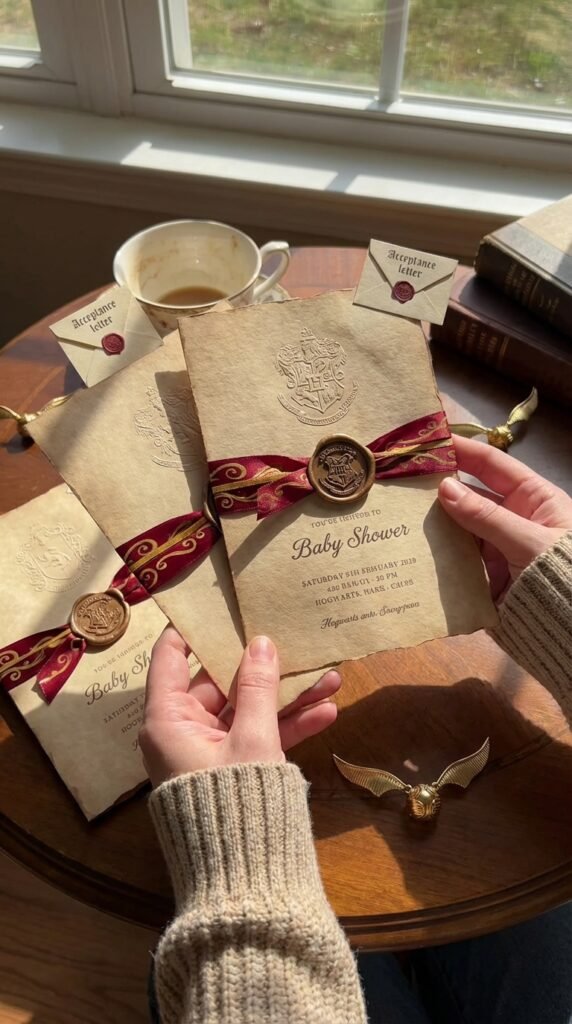 Owls carrying magical news have nothing on your perfectly crafted Harry Potter baby shower invitations that’ll transport guests straight to the wizarding world. Your magical invitations should capture that Hogwarts letter excitement—think parchment paper with wax seals or scroll designs tied with ribbon.