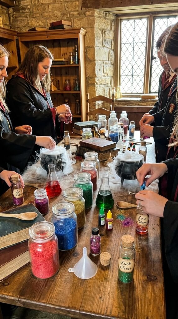 Convert your party space into Professor Snape’s classroom with a bubbling potions station that’ll have guests mixing magical concoctions all afternoon. Set up potion ingredient stations with labeled glass jars containing colorful bath salts, glitter, and food coloring. I’ve found that dry ice creates authentic bubbling effects, though colored water with Alka-Seltzer works safely too.