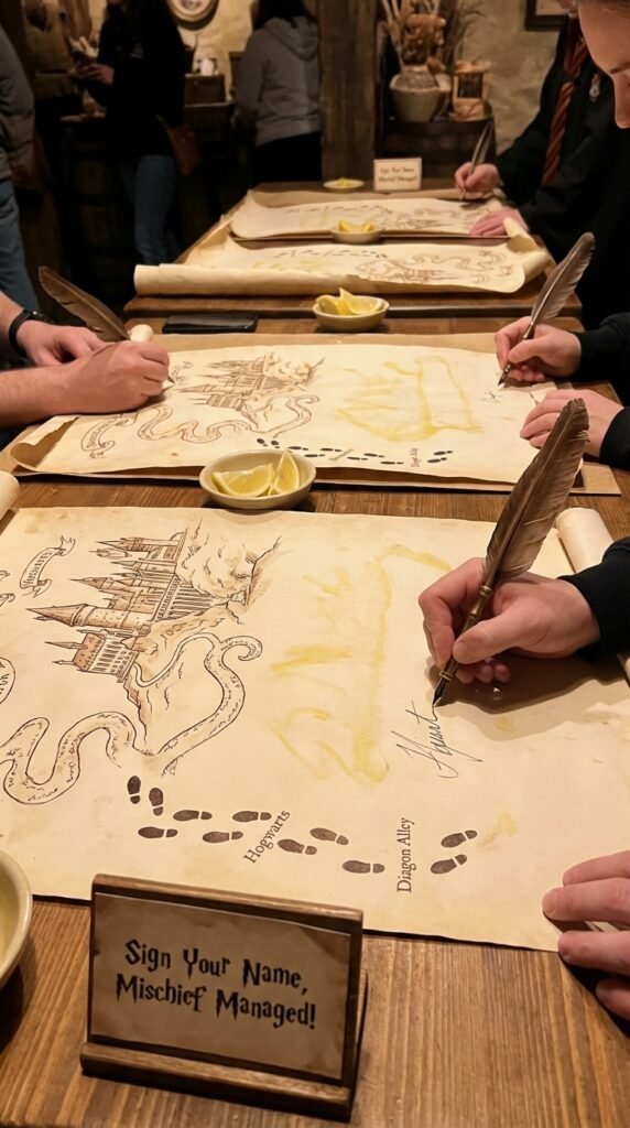 Transform aged parchment paper into Hogwarts’ famous map by drawing footsteps leading to different castle locations. Place sections around your party space, letting guests sign at various “destinations” like the Great Hall or Quidditch Pitch.