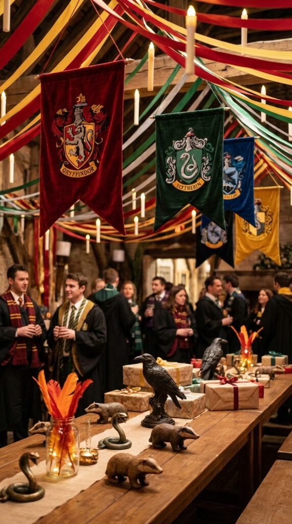 Create stunning house banner displays above your gift table—I’ve found that hanging them at different heights adds visual drama. Position magical creature centerpieces throughout the room: phoenix feathers for Gryffindor, serpent figurines for Slytherin, badgers for Hufflepuff, and ravens for Ravenclaw. These touches instantly transport guests into the wizarding world.