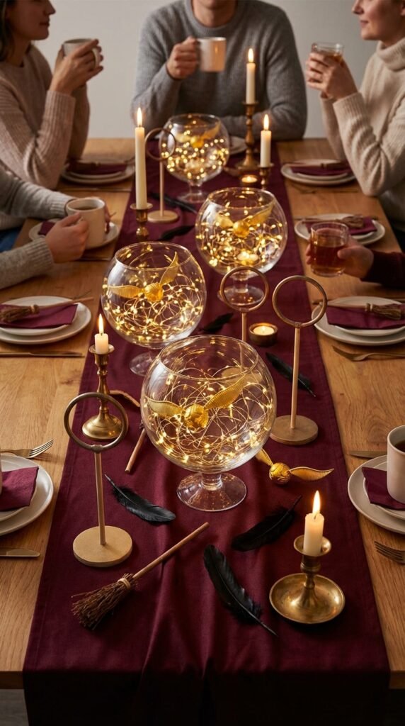 The centerpiece magic happens when you bring Quidditch’s most coveted prize—the Golden Snitch—to your tables. I’ve unearthed that golden snitch replicas work beautifully as floating centerpieces when suspended above glass bowls filled with fairy lights.