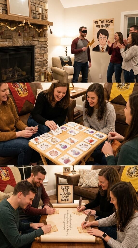 Start with a magical memory matching game using Harry Potter character cards – it’s surprisingly competitive! Then try the enchanted guess the baby’s name challenge where guests predict names using Hogwarts house themes or magical creatures.