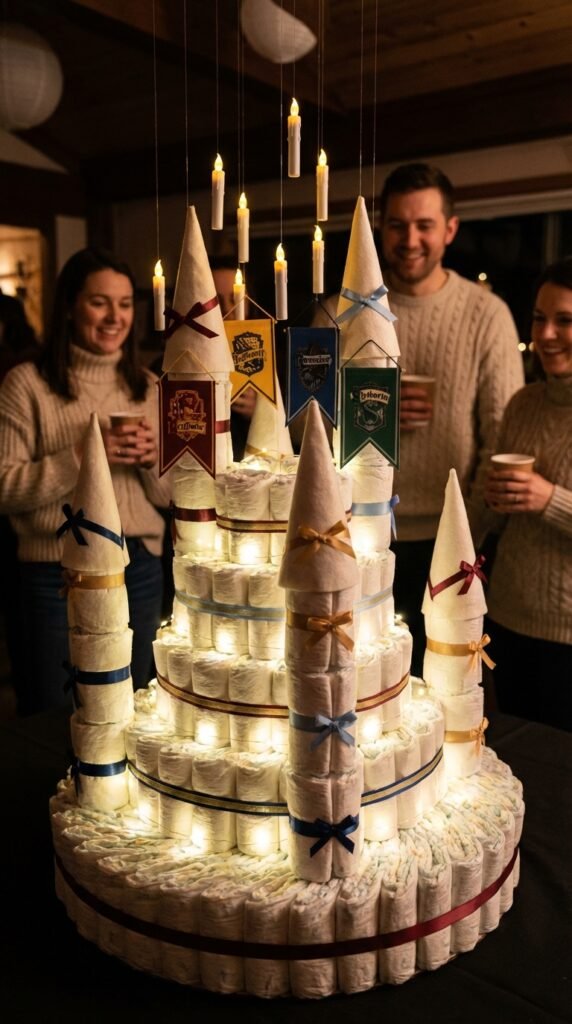 Four towering spires and enchanted details metamorphose an ordinary diaper cake into the crown jewel of your magical celebration. You’ll stack diapers in cylindrical layers, creating Hogwarts’ iconic silhouette with careful placement and securing ribbons.