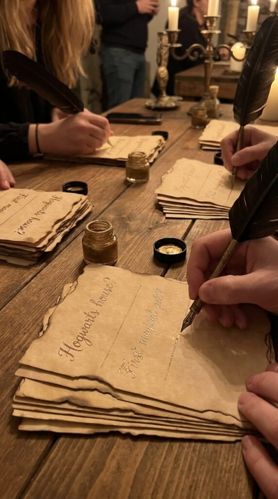 Your sorting hat sorting experience becomes interactive when guests draw house cards from a cauldron, then pin their selections to a poster board. It’s surprisingly engaging—I’ve watched adults debate their choices for minutes!
