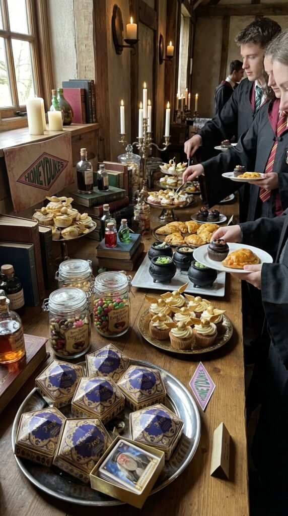 Set up glass apothecary jars filled with enchanted sweets like rock candy “crystals” and chocolate wands. Butterbeer cupcakes topped with golden snitches steal the show every time. Don’t forget pumpkin pasties and cauldron cakes to complete your magical spread.