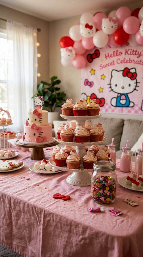 A well-styled Hello Kitty dessert table can bring everything together, displaying cakes, cake pops, and coordinating treats as one cohesive party centerpiece.