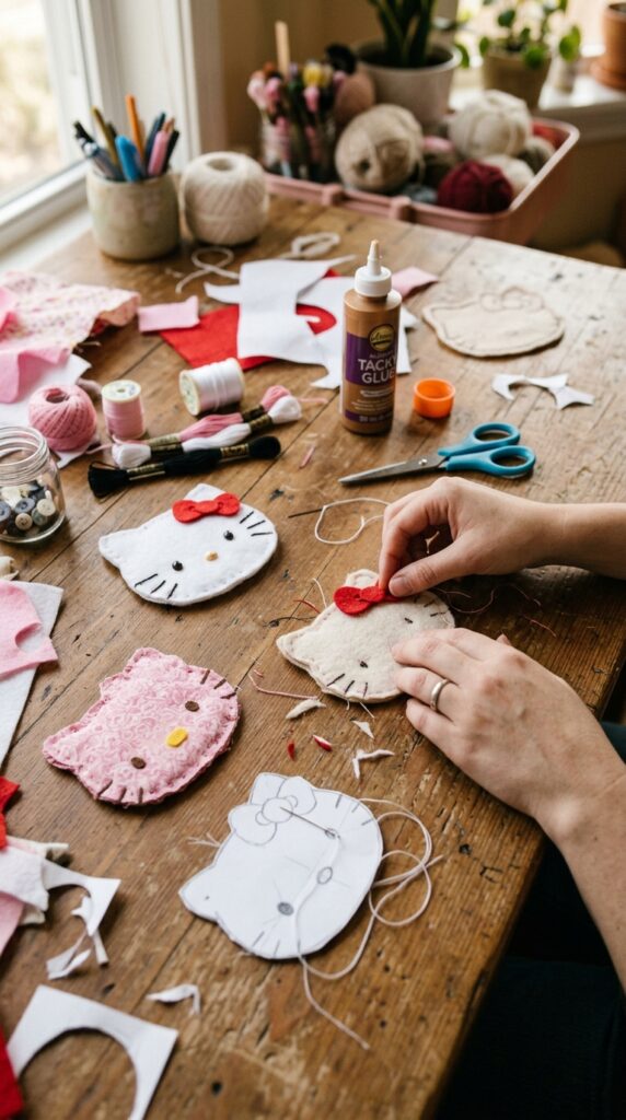 Fabric banners are another winner. Cut pink and white felt triangles, stitch or glue Hello Kitty faces onto alternating pieces, then string them together. They photograph beautifully and cost almost nothing.