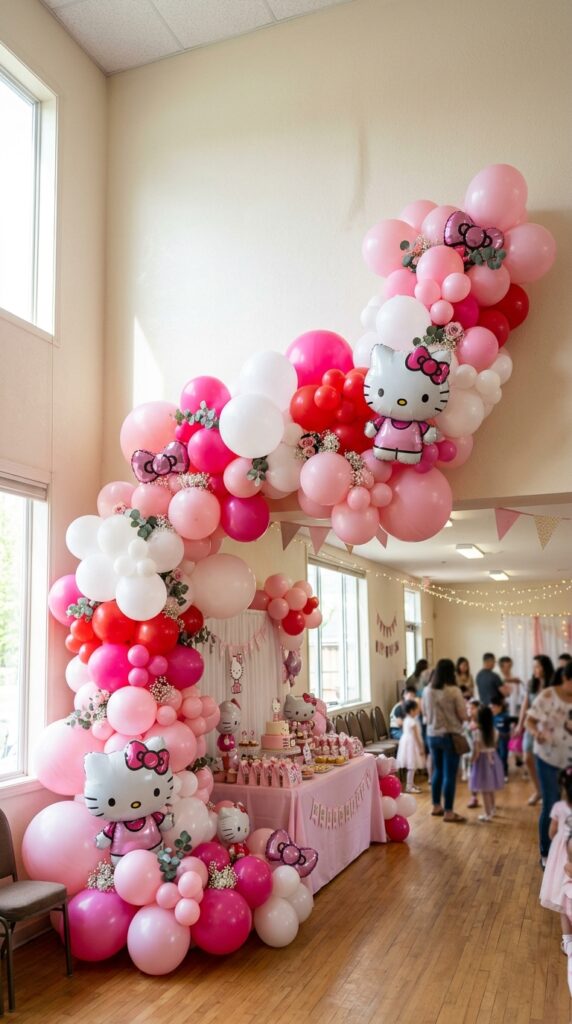 Arch designs work beautifully over entrance doorways or dessert tables, especially in white, pink, and red color schemes that match Hello Kitty’s iconic look. You can layer different balloon sizes to create depth and dimension.