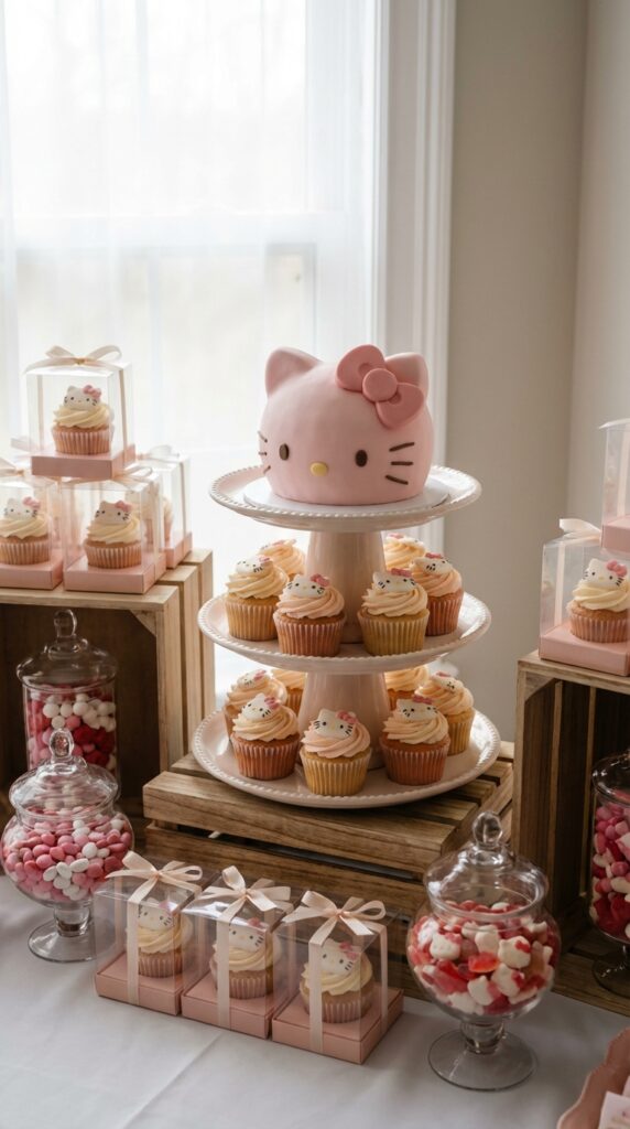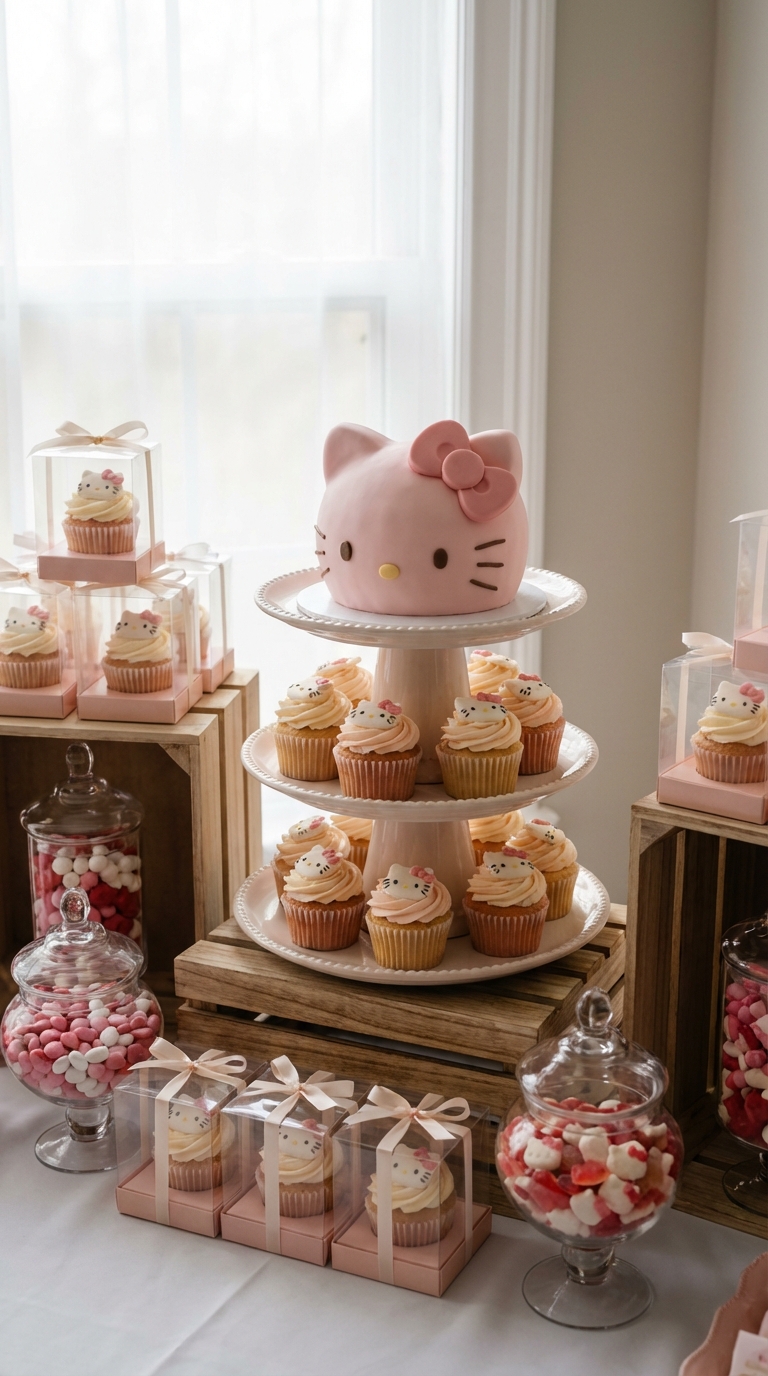 For a showstopping centerpiece, a Hello Kitty cake design can anchor your dessert table while inspiring the rest of your edible favor presentation.