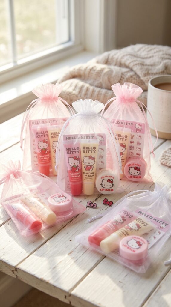 These favors feel special without crossing into grown-up territory. Look for flavored lip balms, skincare samples, and Hello Kitty makeup sets packaged in adorable themed pouches.