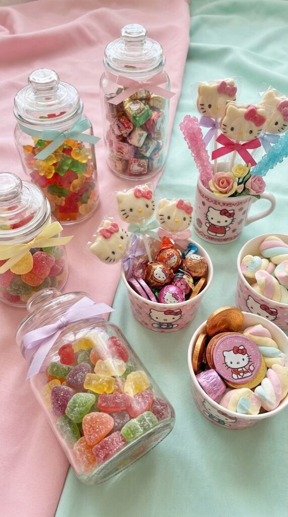 You can fill adorable treat jars with Hello Kitty-themed gummies, lollipops, and wrapped chocolates for a favor guests actually want. Trust me, nobody’s leaving those behind.