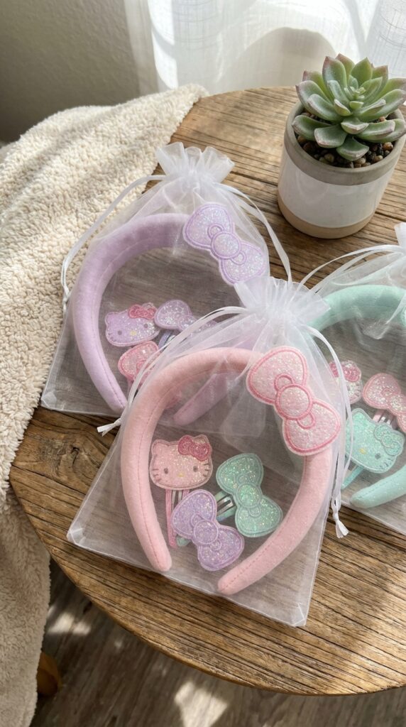 Stock up on Hello Kitty hair clips in sets of three or four per guest. They come in glittery finishes, pastel colors, and even 3D designs. Tuck them into small organza bags for an instant polished presentation.