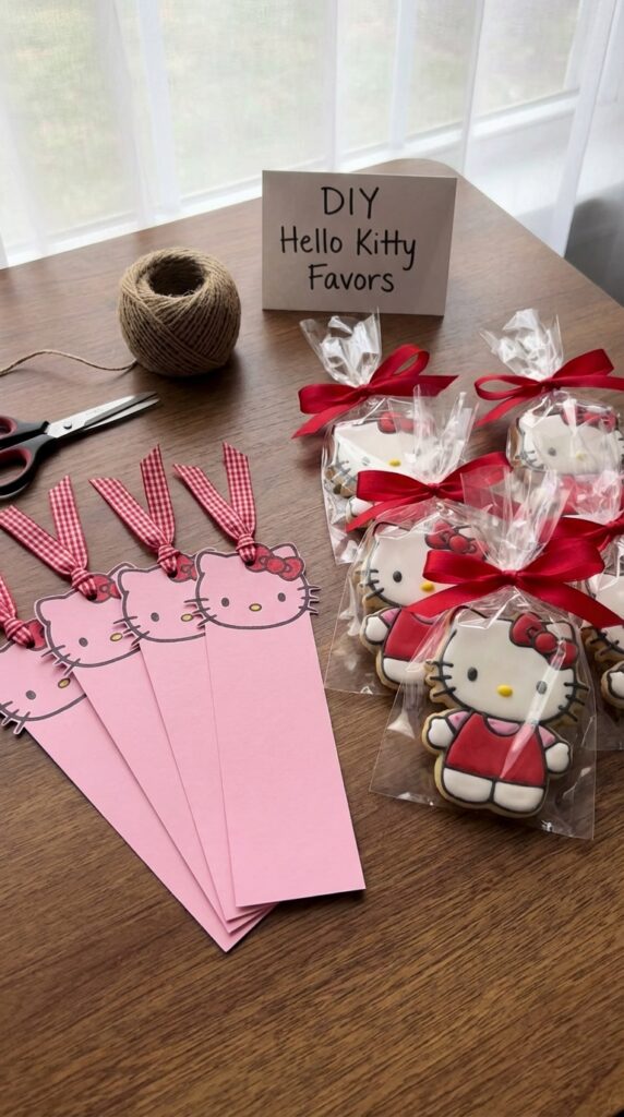 If you’re watching your party budget, DIY Hello Kitty favors are a surprisingly fun way to stretch every dollar without skimping on charm. Try making DIY bookmarks using pink cardstock, a hole punch, and ribbon.