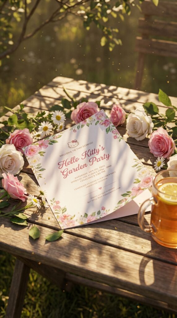 When you imagine Hello Kitty surrounded by blooming roses, ivy, and delicate wildflowers, you’re already halfway to designing the perfect garden party invitation.
