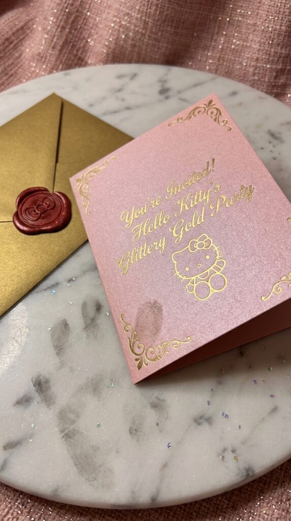 Few things say “birthday royalty” quite like a glittery gold and pink Hello Kitty invitation. You’ll want to choose designs that feature golden sparkle accents along the borders, giving every detail a luxurious finish.