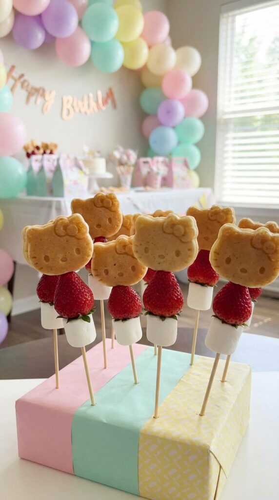 Thread mini Hello Kitty pancakes onto wooden skewers, alternating with strawberries, marshmallows, or chocolate chunks for colorful pancake kebabs that guests actually grab first.