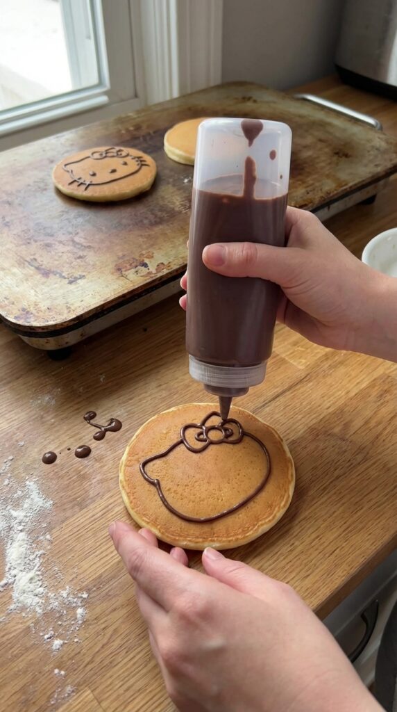If you’re brand new to pancake decorating, don’t let the cute Hello Kitty designs intimidate you — most of the magic comes down to two simple tools: a squeeze bottle and a little patience.
