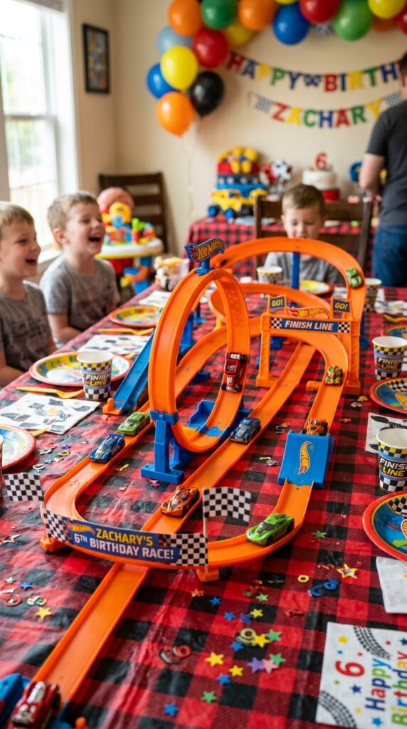 When it comes to table decorations, a Hot Wheels race track centerpiece is honestly one of the coolest options you can go with. You can build custom tracks that weave around party favors and wrap right through your cake display.