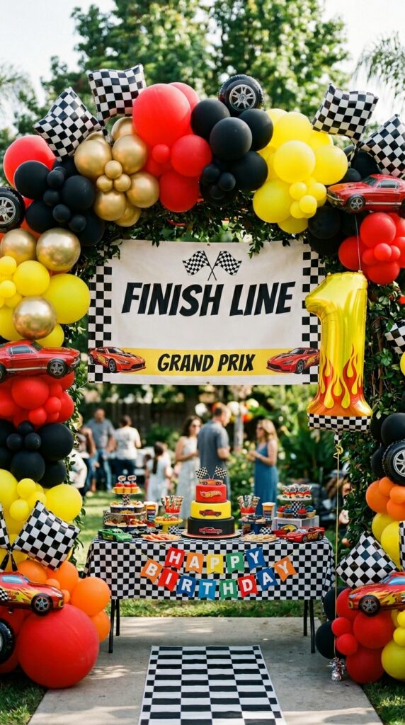 Once you’ve nailed down the activities, it’s time to convert your space into something that actually looks like a race track. Hang a bold “FINISH LINE” banner across the doorway or dessert table — it instantly sets the tone.