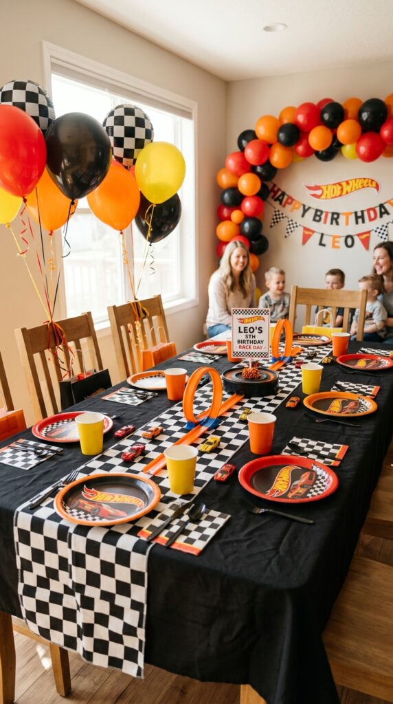 Create a racing backdrop using a large checkered flag print or red and orange flame graphics on foam board. Hang it against a wall and add track pieces around the frame for extra flair. For even more impact, position your backdrop as a party focal point so it naturally draws guests in and anchors the entire themed space.