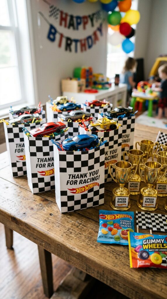 Bundle everything in a checkered flag gift bag, toss in some fruit snacks, and you’ve got a favor worth bragging about on the drive home.