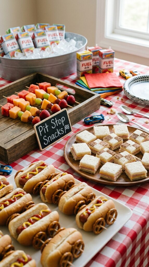 Arrange fruit skewers as “pit stop treats” near a finish-line banner. Serve “fuel” juice boxes with custom labels you can print at home.