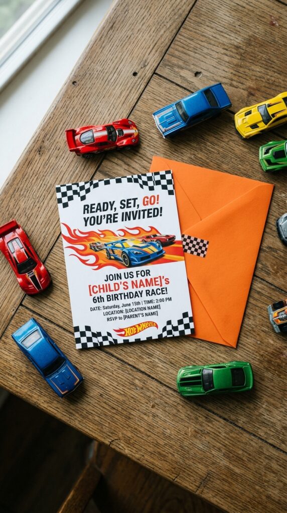 Hot Wheels party invitations that wow guests often include bold color schemes like red, orange, and black to match the iconic brand’s signature look.