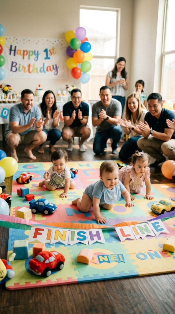 Set up baby races where little ones crawl across a finish line tape while family cheers them on.