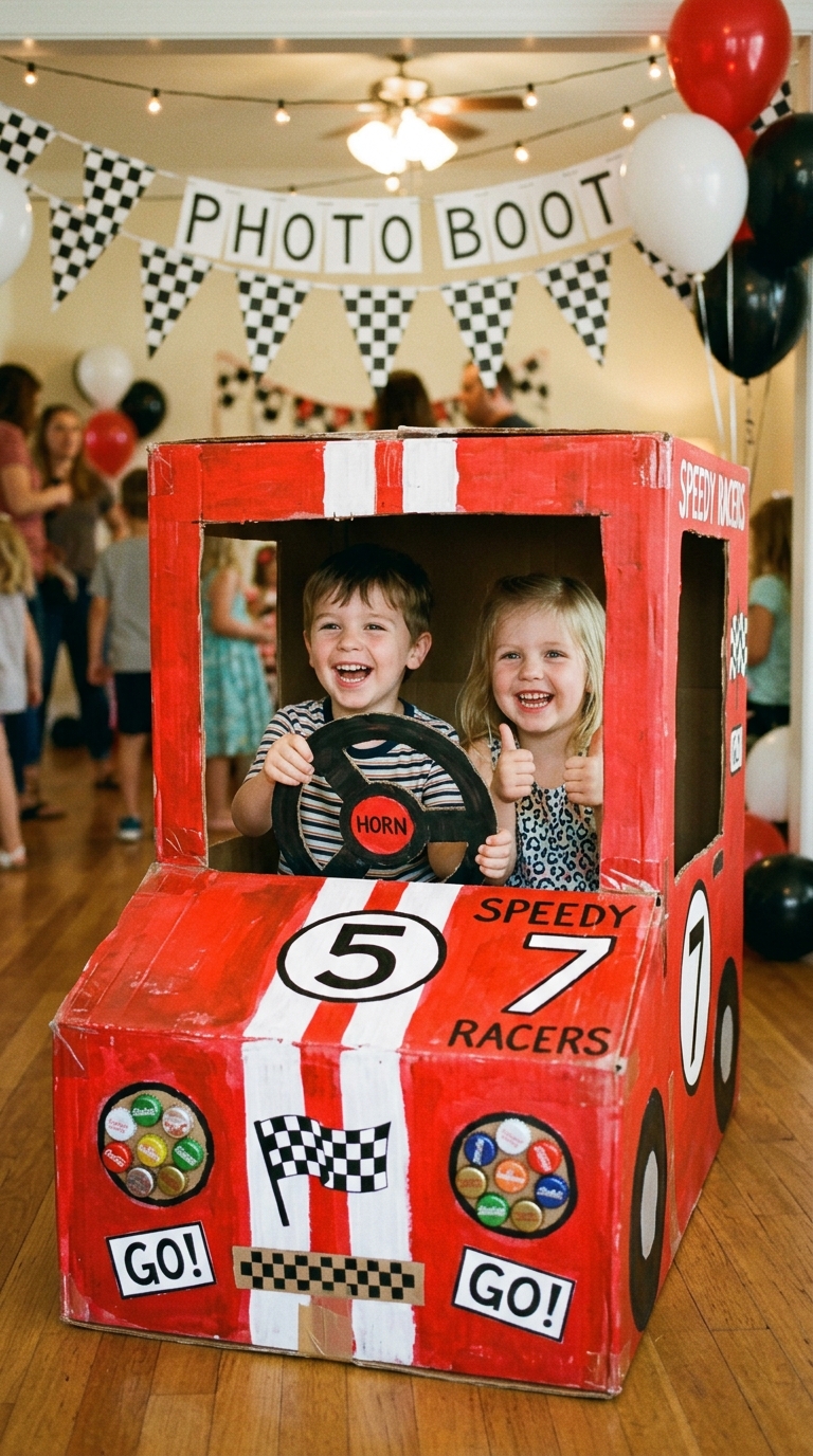 A giant cardboard box race car photo booth is honestly one of the easiest, most impressive party setups you can pull off with minimal budget. Grab a large appliance box and cut out a window for kids to peek through.