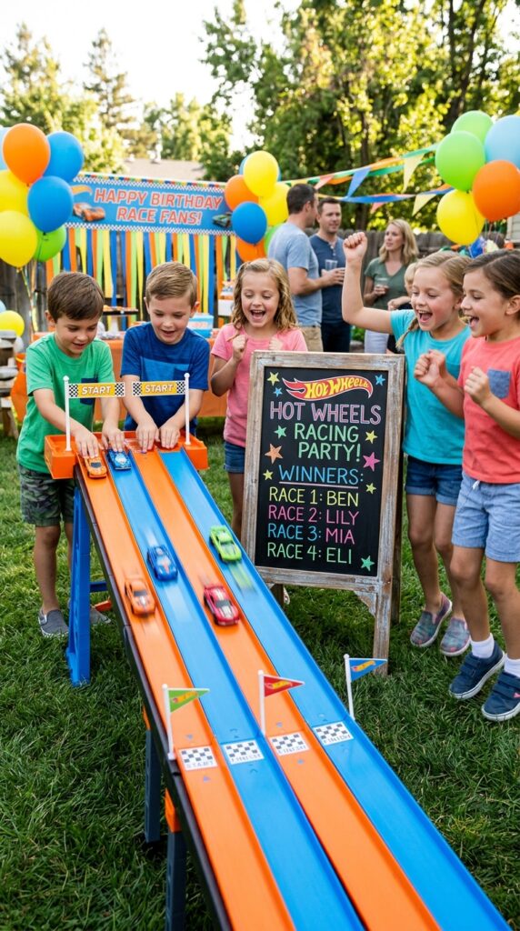 Games are where Hot Wheels parties really come alive, and you’ve got more options than you might think. Set up toy car races using a long track with multiple lanes, letting each kid pick their favorite car. First one across the finish line wins a small prize.