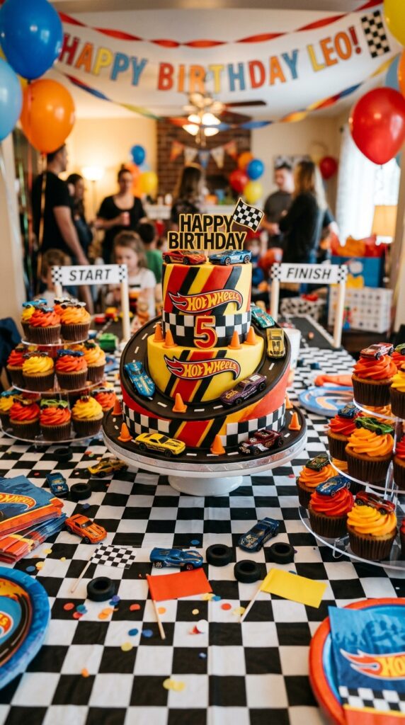 When your little speed racer’s guests arrive, make a bold first impression with a Hot Wheels finish line entry display. Stretch a checkered banner across your doorway using finish line materials like black-and-white streamers, tape, or fabric. It’s simple, affordable, and instantly sets the racing mood.
