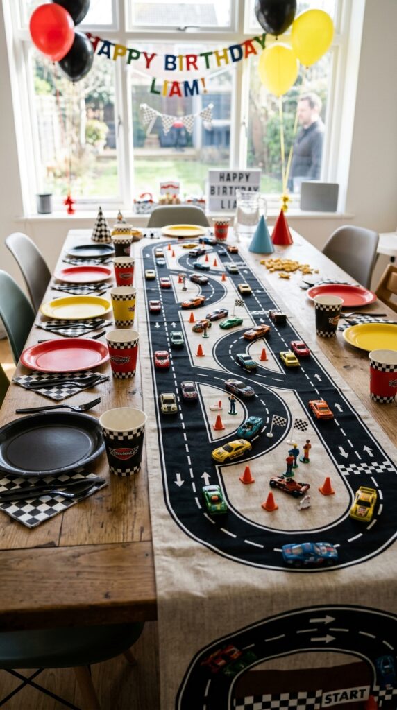 Look for designs featuring race car lanes and a track border design along the edges — these details make the whole setup feel intentional and polished.