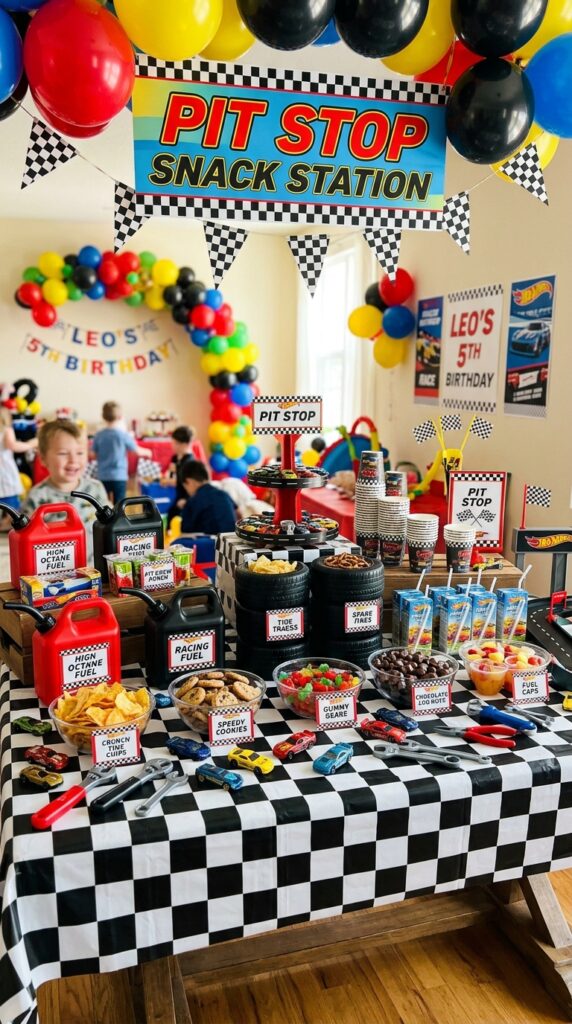 Since every great race has a pit stop, your snack table should have one too. Add pit stop signage above the table using bold, checkered flag fonts that scream racing energy.