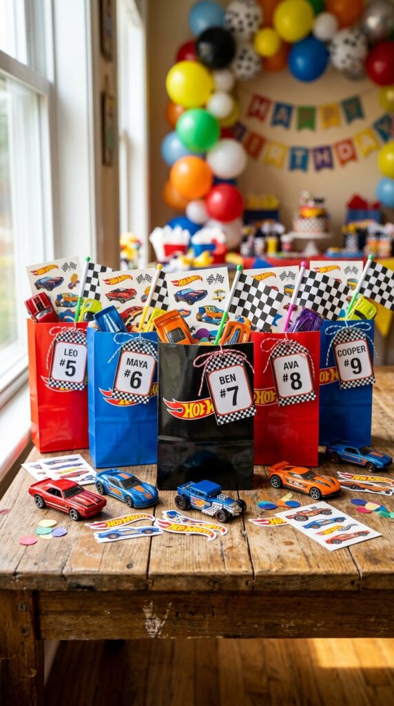 Fill each bag with small toy cars, custom stickers featuring their name or the birthday child’s age, and maybe a pack of racing-themed activity sheets.