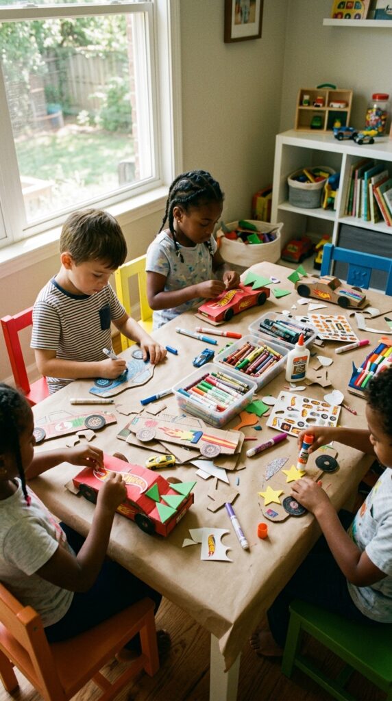 Setting up a craft station gives four-year-olds a creative outlet that goes beyond just playing with cars. Let kids design their own custom racecars using blank cardboard car templates, washable markers, and foam stickers.
