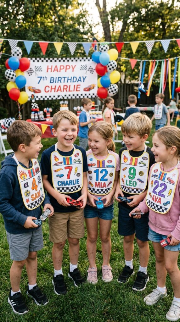 You can customize each bib with the child’s name and a fun racing title like “Speed Demon #4” or “Turbo Kid #7.”