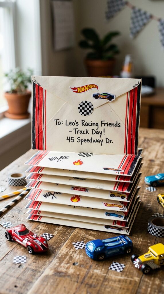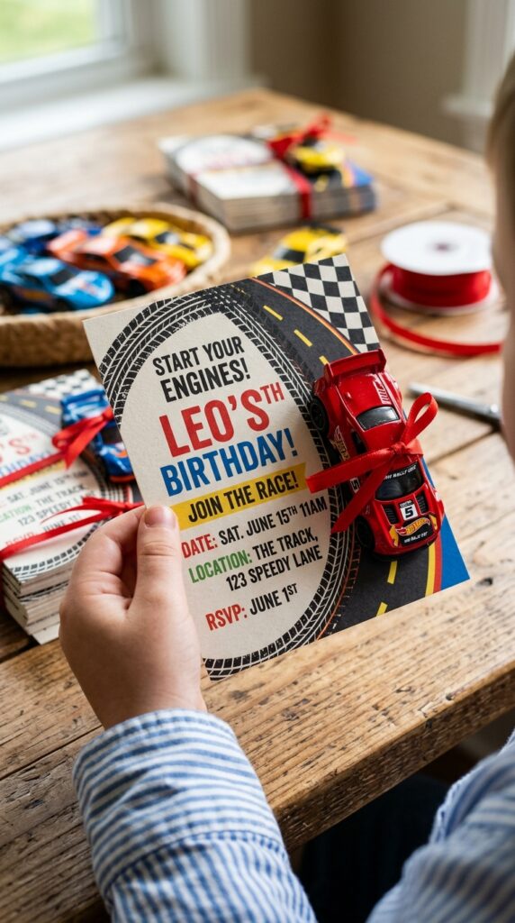 Race car-shaped invites are a fantastic choice, but if you’re the crafty type — or just looking to save a few bucks — DIY checkered flag cards might be your sweet spot.