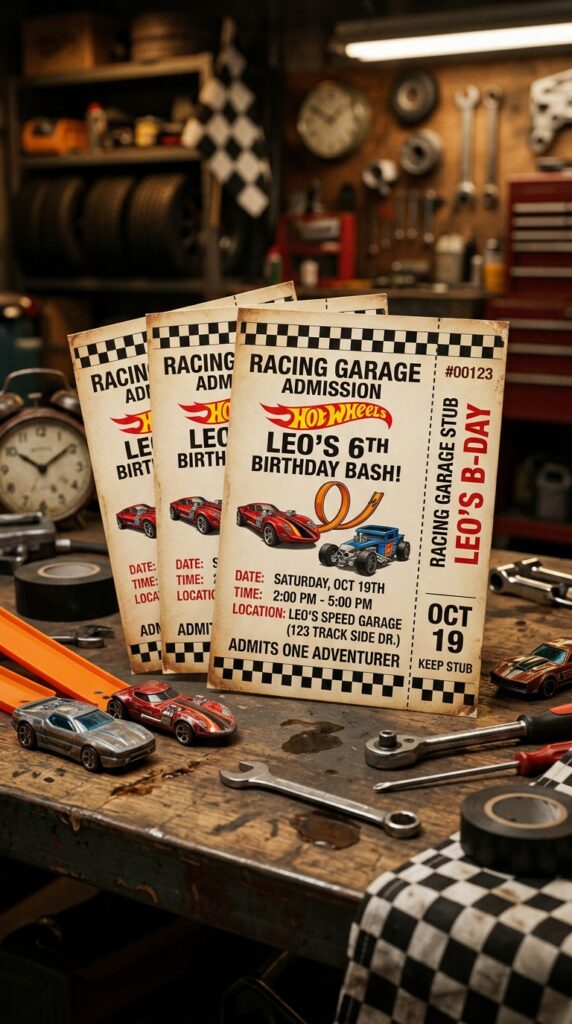 If you want an invitation that feels like it belongs in an actual racing garage, the ticket-style format is your best move.