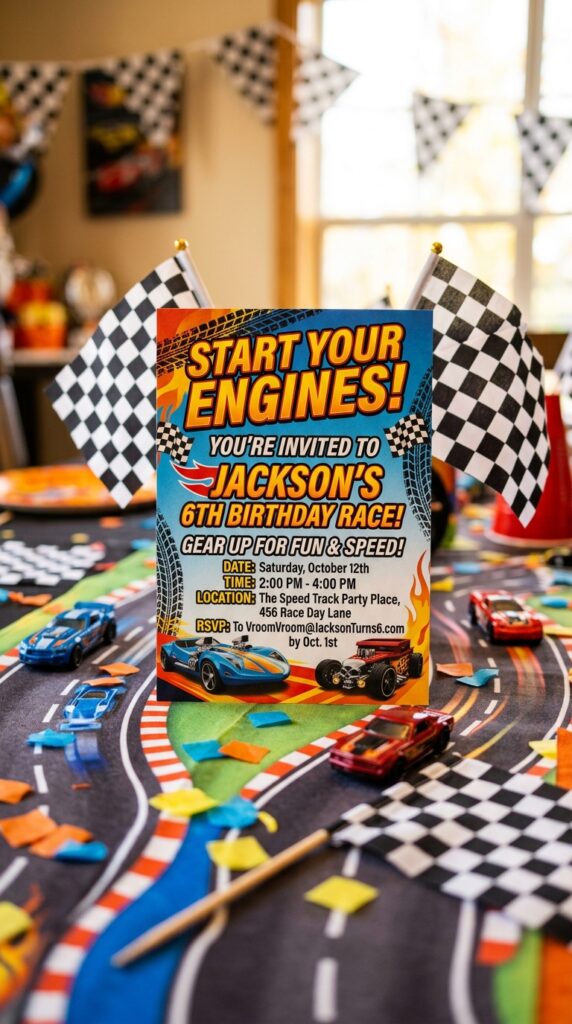You can customize them with themed racing fonts that mimic real race car branding, making each invite feel authentically sporty. Add the party details in bold, speed-inspired typography, and you’ve got something guests won’t toss aside.