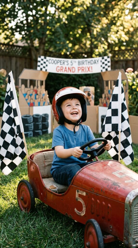 Add personalized props like racing helmets, checkered flags, or a mini steering wheel.