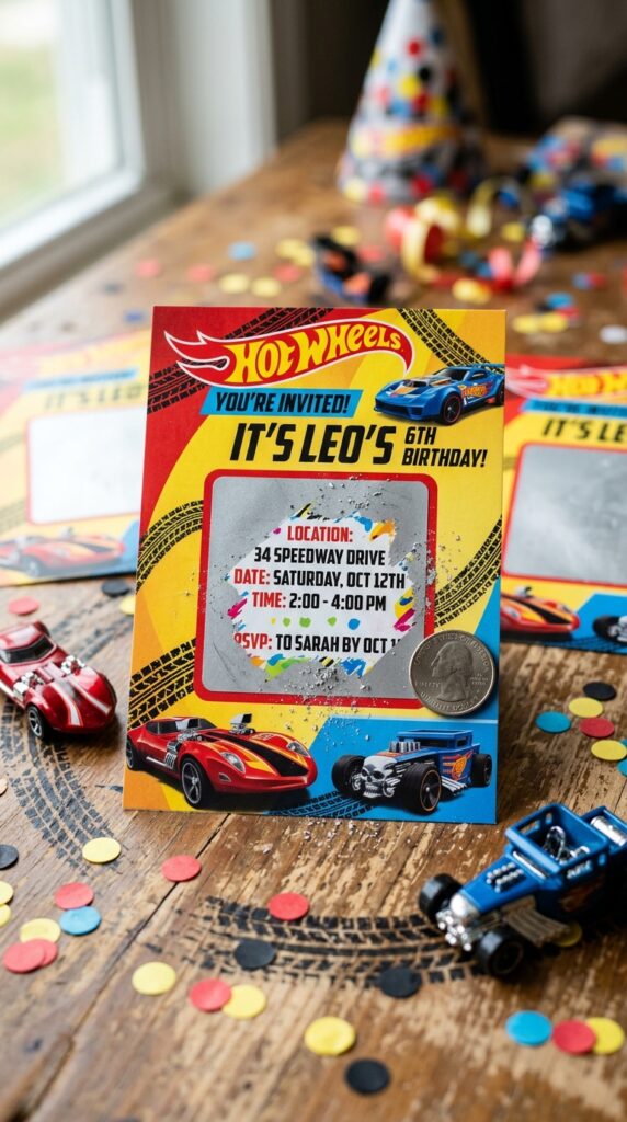 Digital invitations work well for last-minute situations, but physical Hot Wheels cards still feel more special and memorable. Whatever format you choose, always include an RSVP deadline at least five days before your party.